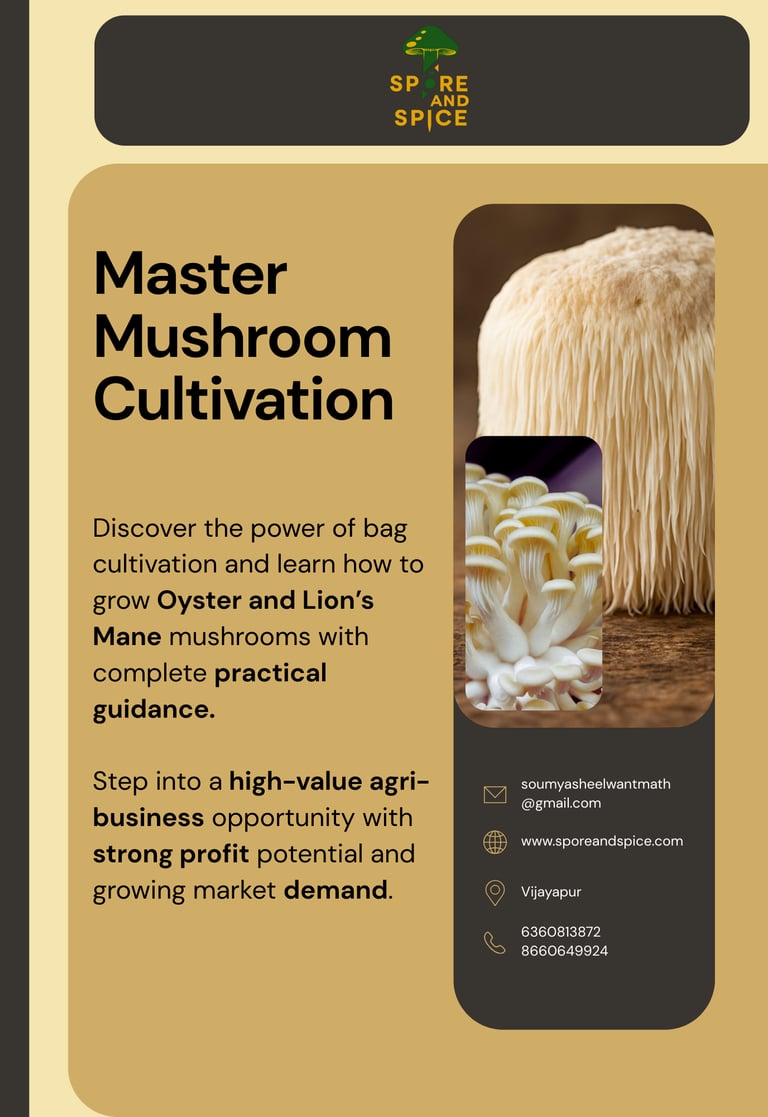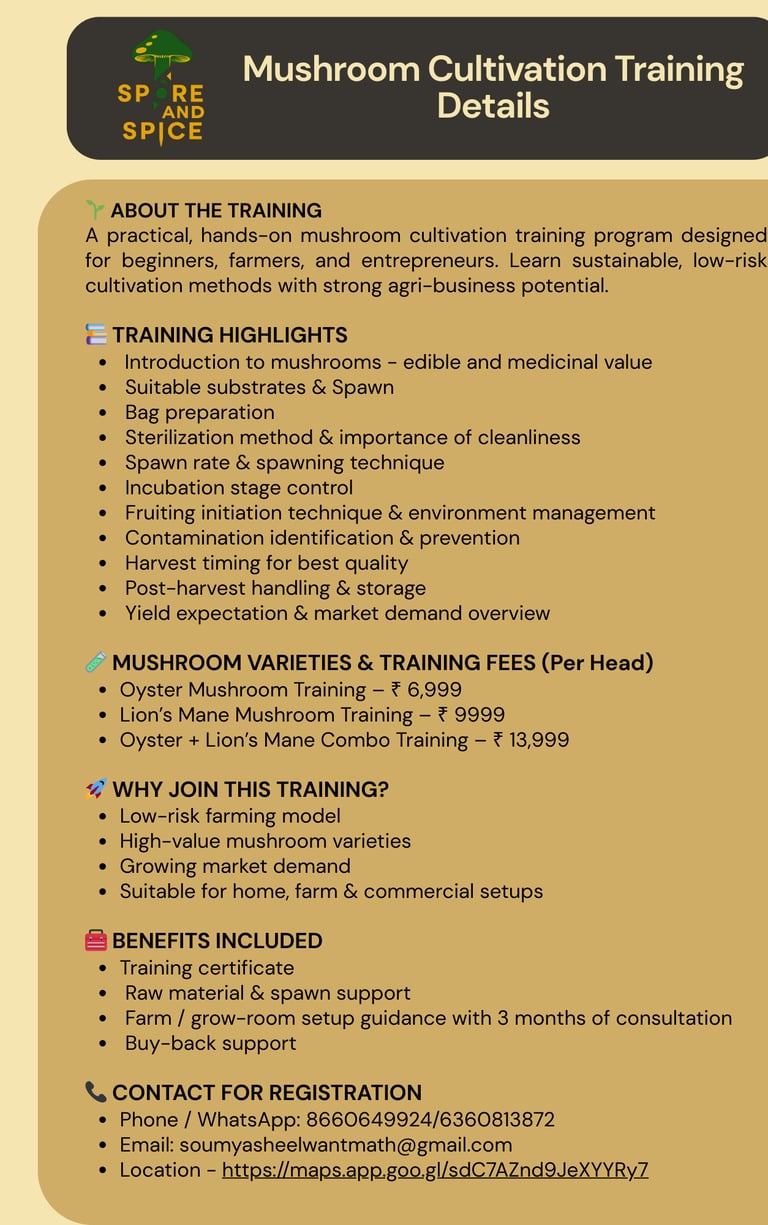 A hands-on, practical mushroom cultivation training designed for beginners, farmers, entrepreneurs, and agri-enthusiasts.This program focuses on sustainable, low-risk, and high-value mushroom farming techniques with real-world business insights.